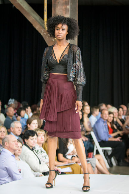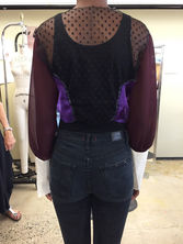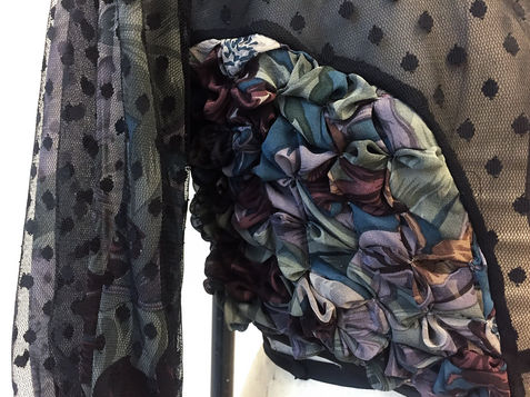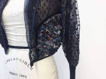 In the process of designing this capsule collection, the goal was to embrace femininity in an unexpected way. Instead of going the expected route and using bright, feminine colors, the color palette was kept subdued and the femininity comes across in the subtle details found in the trims and fabric choices. This jacket puts a modern twist on classic Victorian-era inspiration. Sheer fabrics add lightness and ease to the dark color palette. A floral motif is incorporated, but is also abstracted with fabric manipulation in the shape of abstracted flowers. The flower motif layered on the flower fabric creates an unexpected textile. Dot mesh, puff sleeves, and covered buttons reference the Victorian inspiration. Panels of contrast fabric are included to bring an element of modernity to the designs.